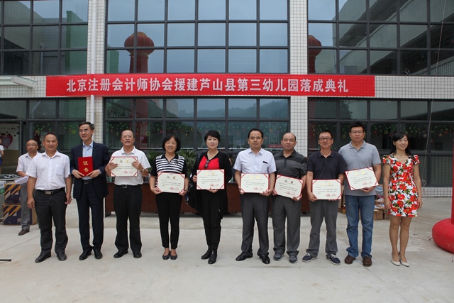 2015年8月26日,北京注协党委率部分参与捐赠的执业机构赴四川省芦山县参加该县第三幼儿园的落成典礼。北京注协党委副书记、北京注(评)协会长郭文杰,北京注协党委副书记孟晓萌,芦山县教育局局长李子发,芦山县第三幼儿园园长杨宗秀出席仪式。我公司殷浩高级副总裁应邀出席了落成典礼,并代表公司接受了由芦山县教委、芦山县教育局颁发的感谢证书。