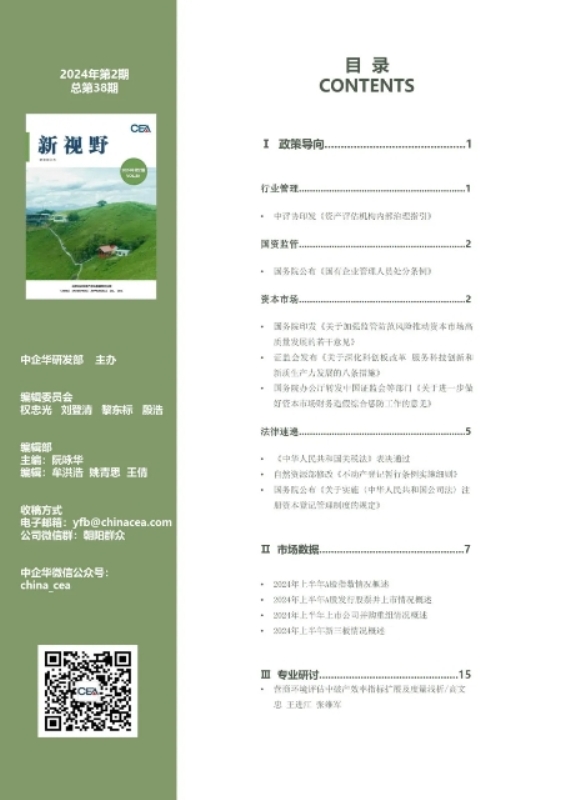中企华公司内刊《新视野》创办于2014年。作为公司专业高地和文化旗舰,迄今已发布38期。在这里,您可以观览政策风向,聚焦资本市场,追踪热点行业,研讨专业问题,了解公司动态。