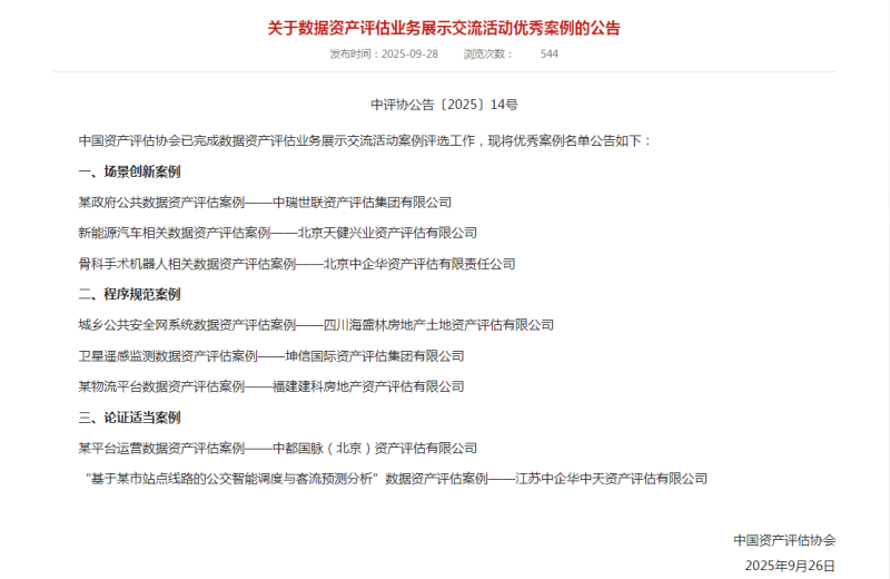9月28日,中国资产评估协会(“中评协”)发布《关于数据资产评估业务展示交流活动优秀案例的公告》(中评协公告〔2025〕14号),公布了在数据资产评估业务展示交流活动中的八个优秀案例。北京中企华资产评估有限责任公司(“中企华”)及其子公司江苏中企华中天资产评估有限公司(“江苏中企华中天”)凭借在数据资产专业领域的深厚积累与卓越实践,共有两个案例成功入选,展现了其在数据资产这一新兴评估领域的前沿探索与专业实力。
