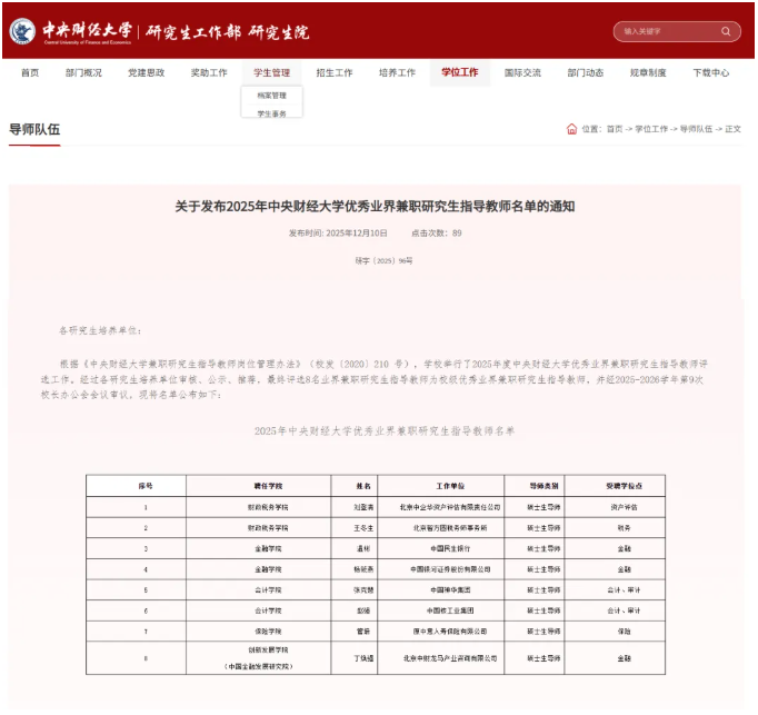 刘登清荣获中央财经大学2025年优秀业界兼职研究生指导教师称号