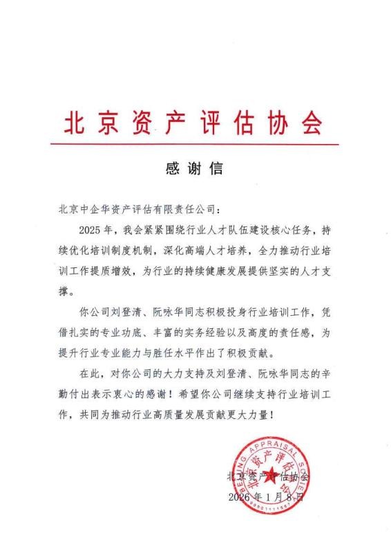 近日,中企华公司收到来自北京资产评估协会(以下简称“北京评协”)的感谢信,对公司的大力支持及刘登清、阮咏华对行业培训工作的卓越贡献表示衷心感谢。