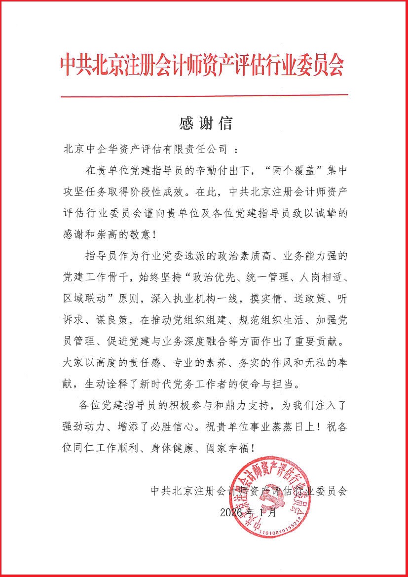 近日,北京中企华资产评估有限责任公司(“中企华公司”或“公司”)收到北京注册会计师资产评估行业党委发来的感谢信,对公司在推动行业党建“两个覆盖”集中攻坚任务中所作出的积极贡献及选派的各位党建指导员的辛勤付出表示诚挚感谢和崇高敬意。