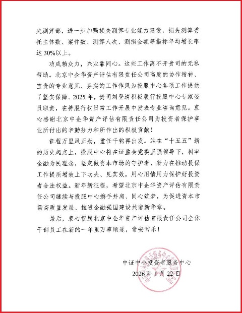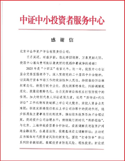 近日,北京中企华资产评估有限责任公司(简称“中企华”)收到来自中证中小投资者服务中心(简称“投服中心”)的感谢信。信中对中企华及其总裁兼CEO刘登清在2025年为投资者保护事业付出的辛勤努力和作出的积极贡献表示衷心感谢,并对中企华高度的协作精神、宝贵的专业意见与务实的工作作风给予高度认可。