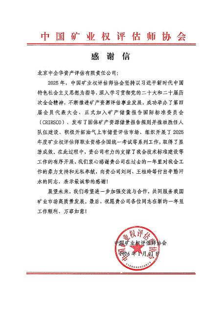 近日,中企华收到来自中国矿业权评估师协会的感谢信,对中企华2025年给予中国矿业权评估师协会的支持表示衷心感谢!